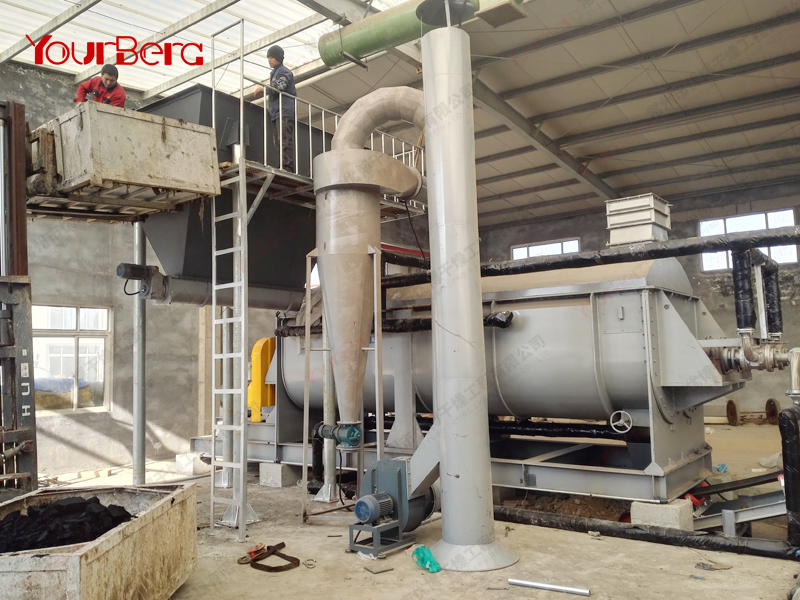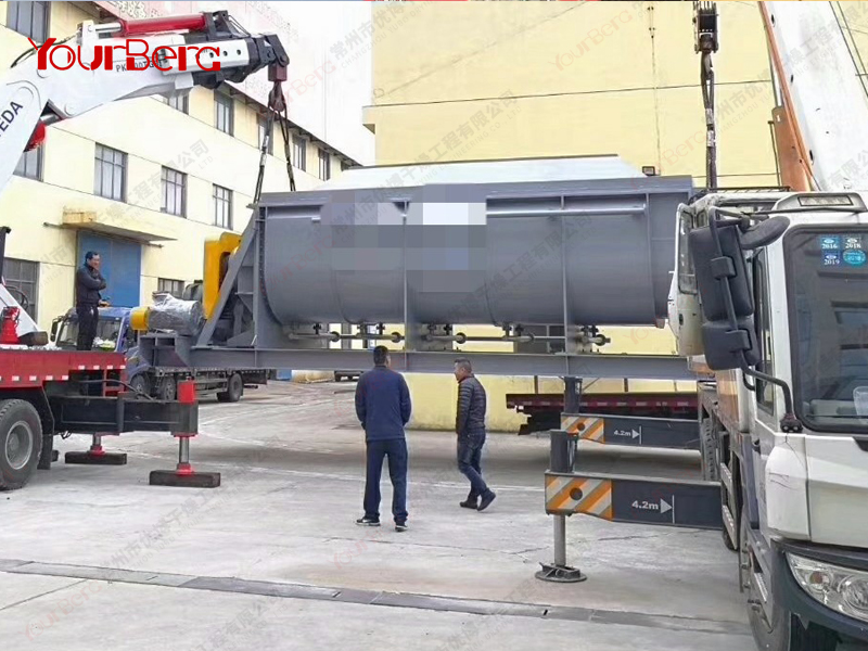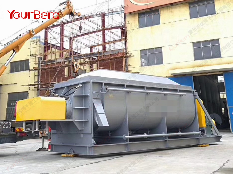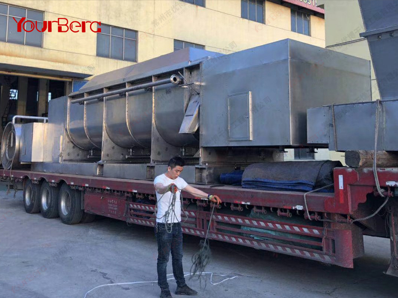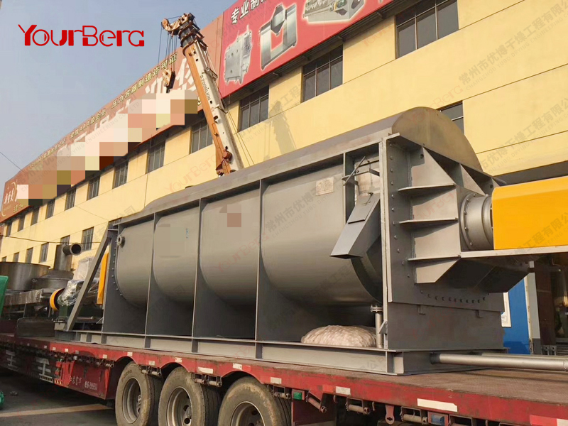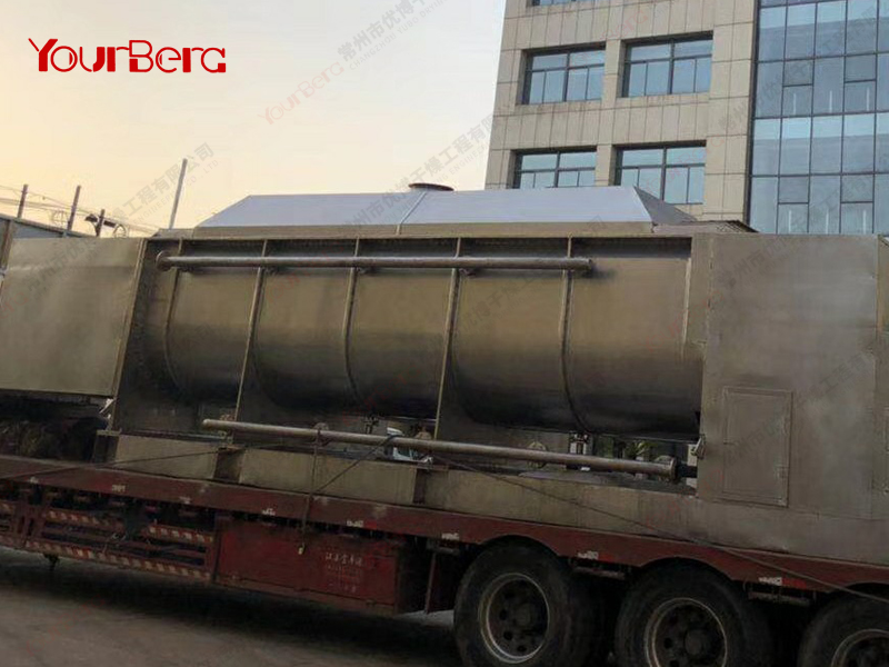 空心軸上密集排列著楔型中空漿葉,熱介質(zhì)經(jīng)空心軸流經(jīng)漿葉。單位有效容積內(nèi)傳熱面積很大,熱介質(zhì)溫度從-40℃到320℃,可以是水蒸汽,也可以是液體型:如熱水、導(dǎo)熱油等。間接傳導(dǎo)加熱,沒有攜帶空氣帶走熱量,熱量均用來加熱物料。熱量損失僅為通過器體保溫層向環(huán)境的散熱。楔型漿葉傳熱面具有自清潔功能。物料顆粒與楔型面的相對(duì)運(yùn)動(dòng)產(chǎn)生洗刷作用,能夠洗刷掉楔型面上附著物料,使運(yùn)轉(zhuǎn)中一直保持著清潔的傳熱面。漿葉干燥機(jī)的殼體為Ω型,殼體內(nèi)一般安排二到四根空心攪拌軸。殼體有密封端蓋與上蓋,防止物料粉塵外泄而充分發(fā)揮作用。