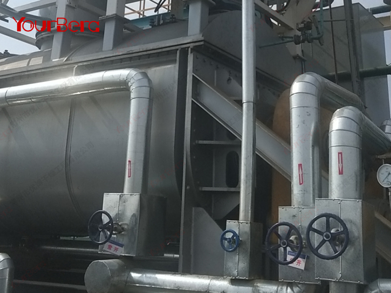 空心軸上密集排列著楔型中空漿葉,熱介質(zhì)經(jīng)空心軸流經(jīng)漿葉。單位有效容積內(nèi)傳熱面積很大,熱介質(zhì)溫度從-40℃到320℃,可以是水蒸汽,也可以是液體型:如熱水、導熱油等。間接傳導加熱,沒有攜帶空氣帶走熱量,熱量均用來加熱物料。熱量損失僅為通過器體保溫層向環(huán)境的散熱。楔型漿葉傳熱面具有自清潔功能。物料顆粒與楔型面的相對運動產(chǎn)生洗刷作用,能夠洗刷掉楔型面上附著物料,使運轉(zhuǎn)中一直保持著清潔的傳熱面。漿葉干燥機的殼體為Ω型,殼體內(nèi)一般安排二到四根空心攪拌軸。殼體有密封端蓋與上蓋,防止物料粉塵外泄而充分發(fā)揮作用。