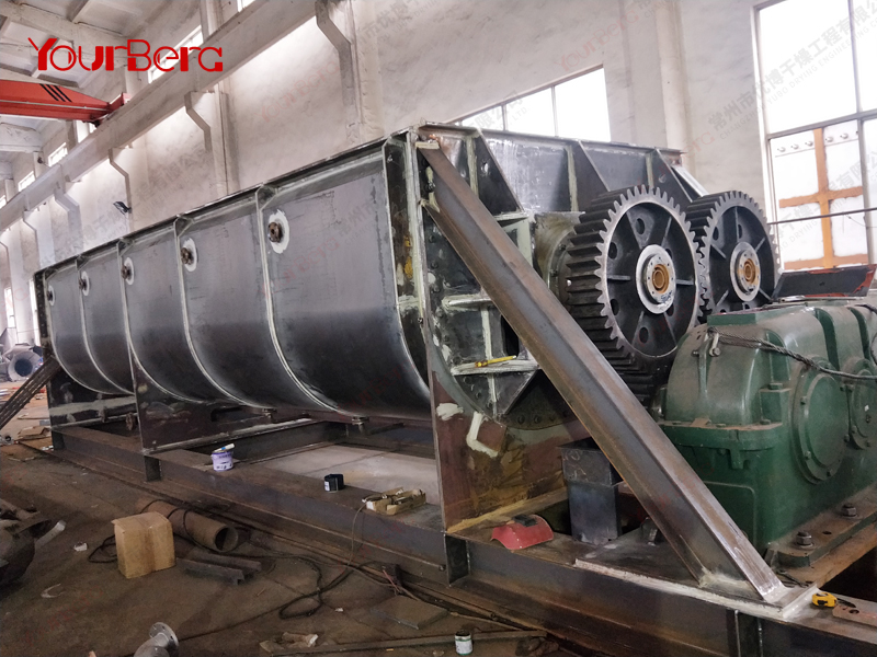 空心軸上密集排列著楔型中空漿葉,熱介質(zhì)經(jīng)空心軸流經(jīng)漿葉。單位有效容積內(nèi)傳熱面積很大,熱介質(zhì)溫度從-40℃到320℃,可以是水蒸汽,也可以是液體型:如熱水、導(dǎo)熱油等。間接傳導(dǎo)加熱,沒有攜帶空氣帶走熱量,熱量均用來(lái)加熱物料。熱量損失僅為通過器體保溫層向環(huán)境的散熱。楔型漿葉傳熱面具有自清潔功能。物料顆粒與楔型面的相對(duì)運(yùn)動(dòng)產(chǎn)生洗刷作用,能夠洗刷掉楔型面上附著物料,使運(yùn)轉(zhuǎn)中一直保持著清潔的傳熱面。漿葉干燥機(jī)的殼體為Ω型,殼體內(nèi)一般安排二到四根空心攪拌軸。殼體有密封端蓋與上蓋,防止物料粉塵外泄而充分發(fā)揮作用。