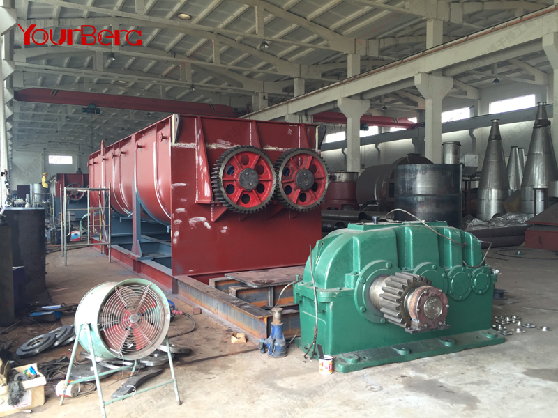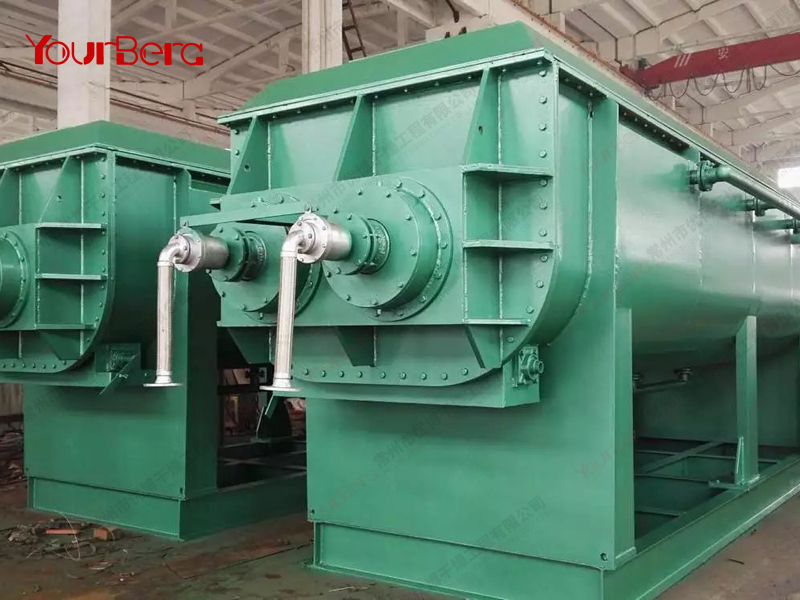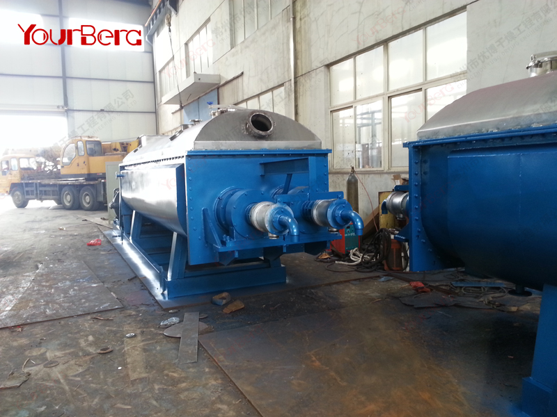空心軸上密集排列著楔型中空漿葉,熱介質(zhì)經(jīng)空心軸流經(jīng)漿葉。單位有效容積內(nèi)傳熱面積很大,熱介質(zhì)溫度從-40℃到320℃,可以是水蒸汽,也可以是液體型:如熱水、導(dǎo)熱油等。間接傳導(dǎo)加熱,沒(méi)有攜帶空氣帶走熱量,熱量均用來(lái)加熱物料。熱量損失僅為通過(guò)器體保溫層向環(huán)境的散熱。楔型漿葉傳熱面具有自清潔功能。物料顆粒與楔型面的相對(duì)運(yùn)動(dòng)產(chǎn)生洗刷作用,能夠洗刷掉楔型面上附著物料,使運(yùn)轉(zhuǎn)中一直保持著清潔的傳熱面。漿葉干燥機(jī)的殼體為Ω型,殼體內(nèi)一般安排二到四根空心攪拌軸。殼體有密封端蓋與上蓋,防止物料粉塵外泄而充分發(fā)揮作用。