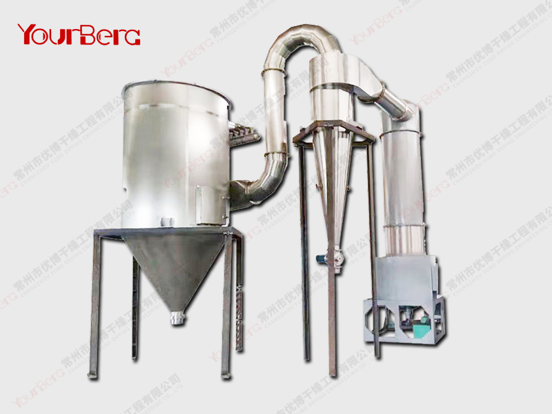 粒度分級(jí):在干燥主機(jī)的上部設(shè)置環(huán)形擋板,此被稱為閃蒸干燥機(jī)分級(jí)器。當(dāng)物料運(yùn)動(dòng)經(jīng)過該分級(jí)器時(shí)變會(huì)受到離心力的作用,呈現(xiàn)不同旋轉(zhuǎn)半徑螺旋上升的趨勢。粒徑較小的物料從分級(jí)器的內(nèi)孔排出;顆粒較大的物料被留在干燥室內(nèi)繼續(xù)粉碎,待達(dá)到標(biāo)準(zhǔn)粒度從內(nèi)孔排出。