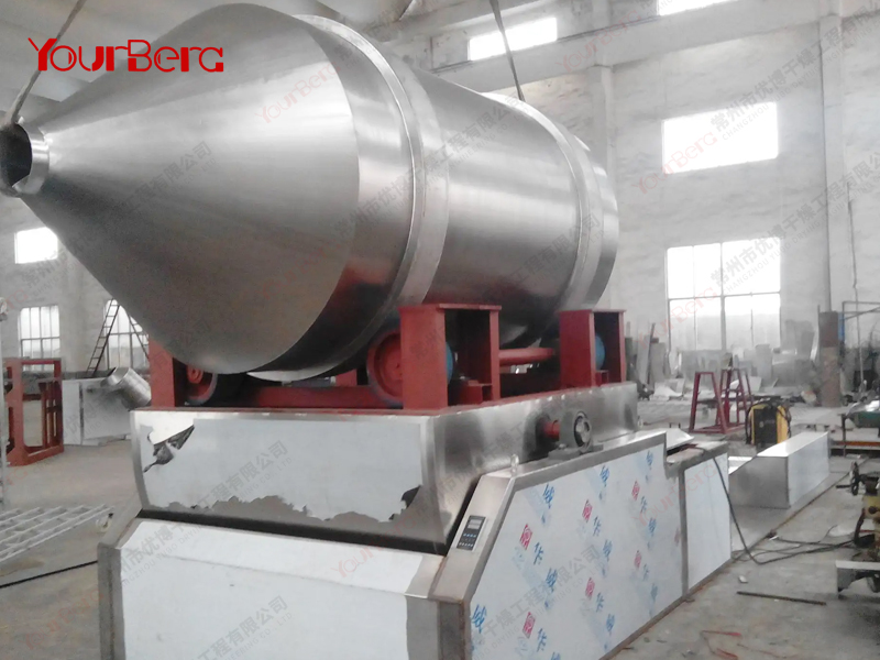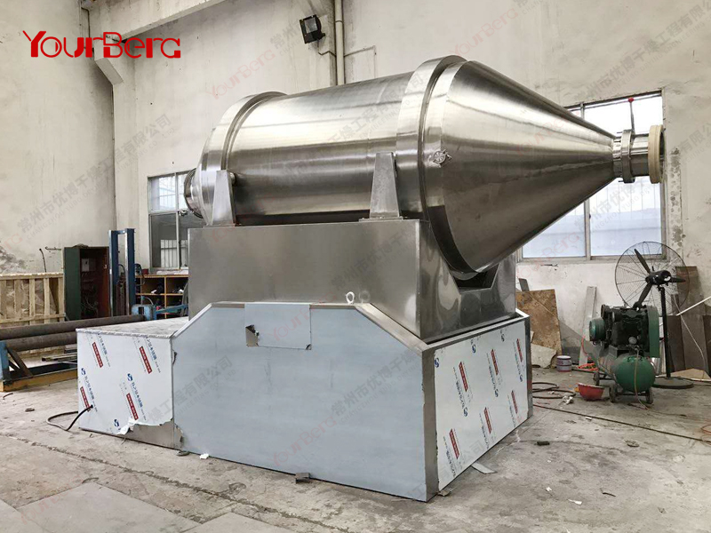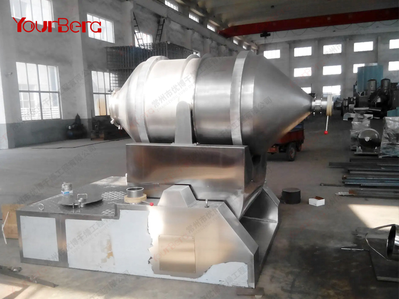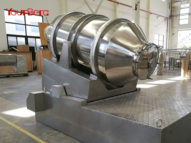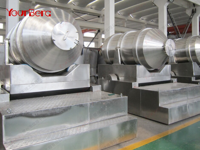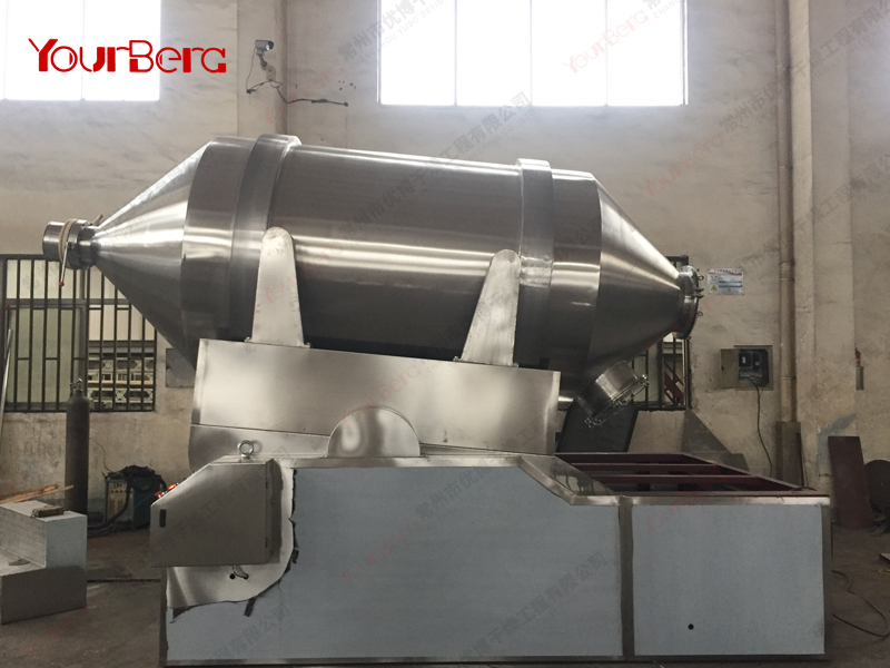 EYH系列二維運動混合機主要由轉(zhuǎn)筒、擺動架、機架三大部分構(gòu)成。轉(zhuǎn)筒裝在擺動架上,由四個滾輪支撐并由兩個擋輪對其進(jìn)行軸向定位。在四個支撐滾輪中,其中兩個傳動輪由轉(zhuǎn)動動力系統(tǒng)拖動使轉(zhuǎn)筒產(chǎn)生轉(zhuǎn)動;擺動架由一組曲柄擺桿機構(gòu)來驅(qū)動,曲柄擺桿機構(gòu)裝在機架上,擺動架由軸承組件支撐在機架上。